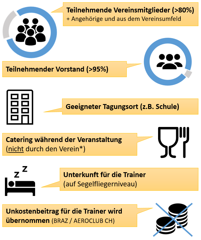 Da der FLYTOP-Kurs für Vereine tief in die Kommunikation / Struktur eingreift um seine Wirkung zu erzielen, ist es notwendig, dass bestimmte Bedingungen erfüllt werden.